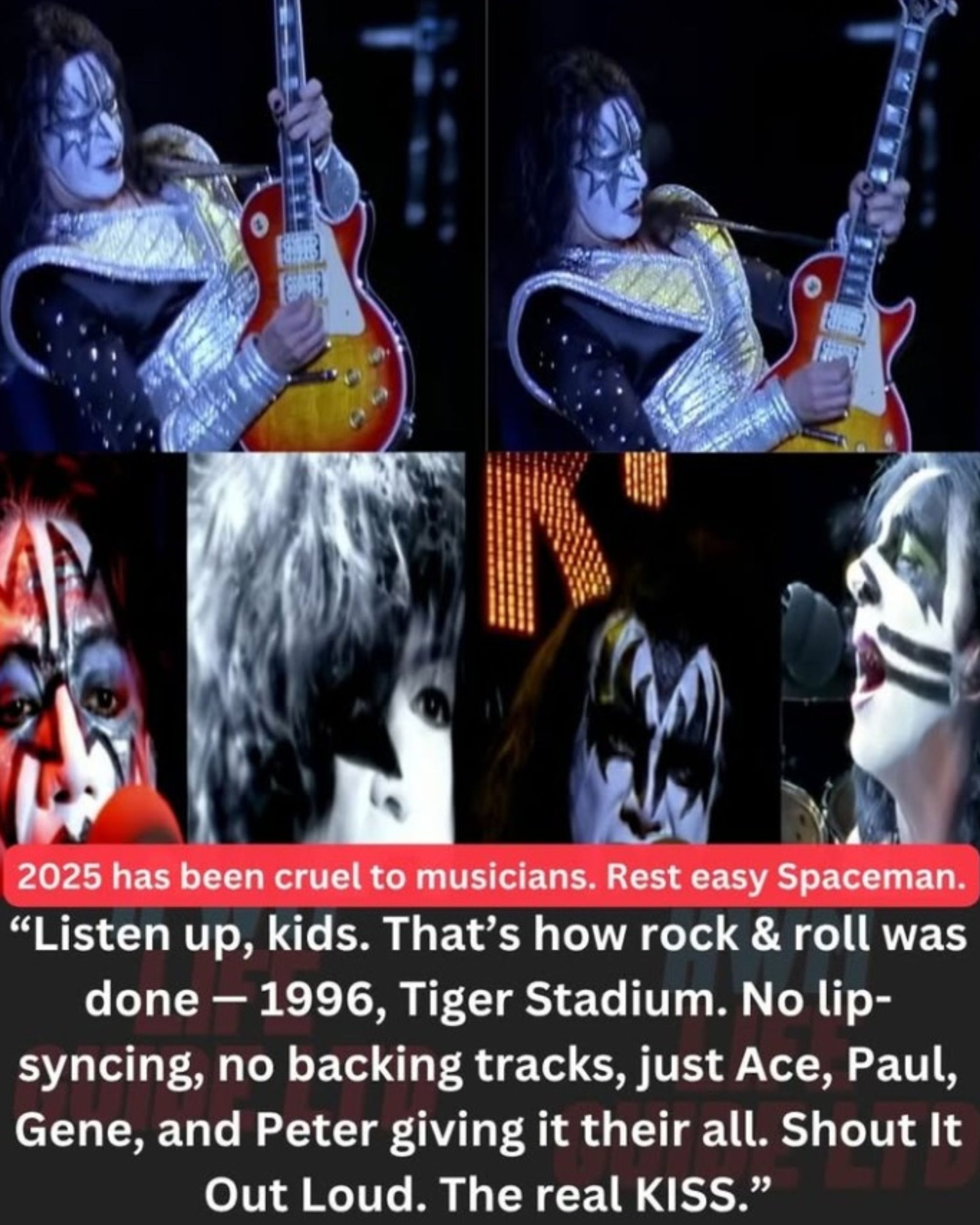 That solo. That smile. That spark. Ace’s performance on that night at Tiger Stadium remains one of the purest expressions of who he was — wild, brilliant, untamed. Watching it now, it feels like a transmission from the stars. His spirit still dances across every note, reminding us that while life ends, legends do not.