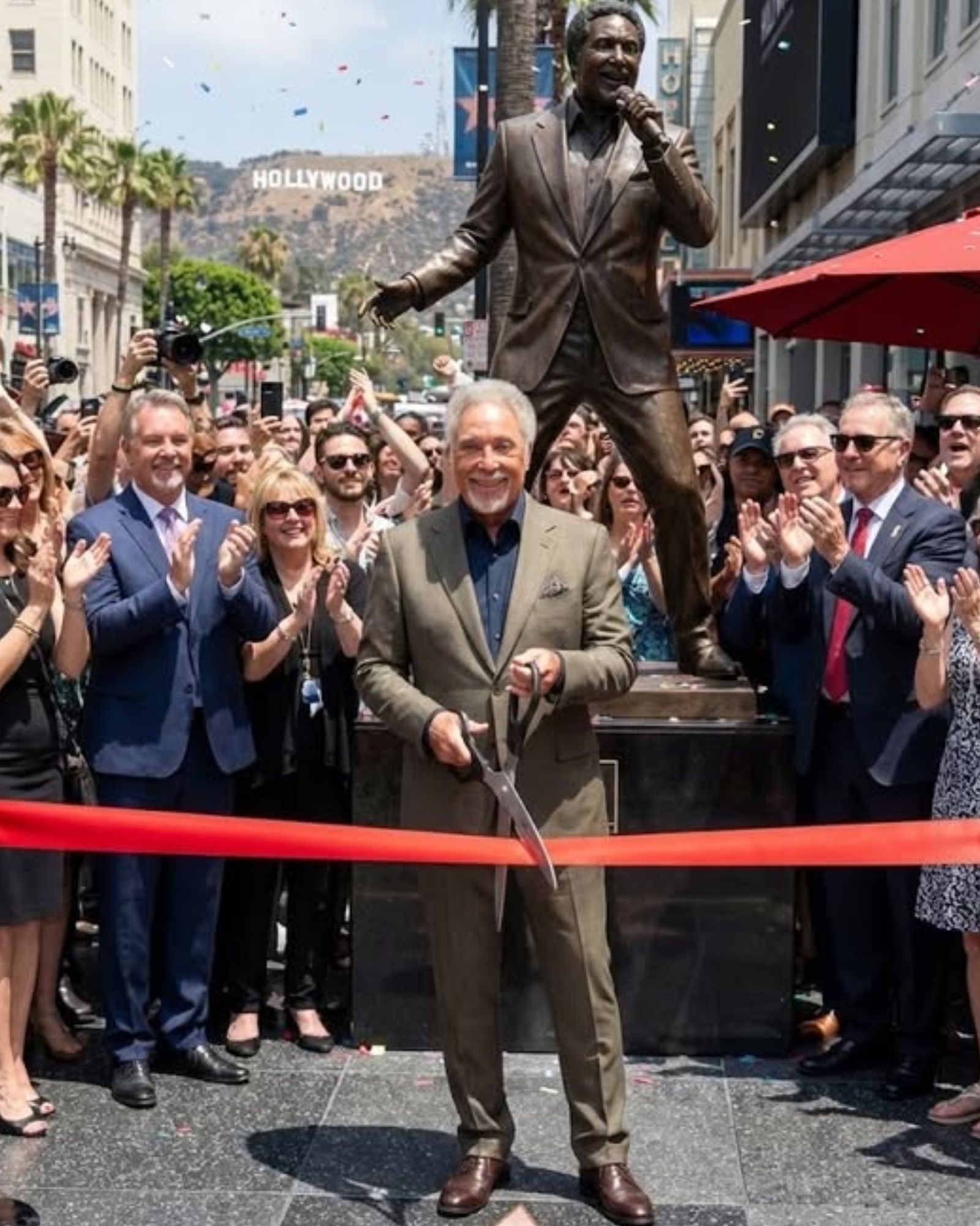 That morning, Sunset Boulevard felt like it was holding its breath. The street was packed shoulder-to-shoulder, phones lifted high, faces glowing with the kind of emotion you only see a few times in a lifetime. And right there in the center of it all stood Sir Tom Jones, quietly staring at a full-body bronze statue of his 1970s self towering more than nine feet into the air.