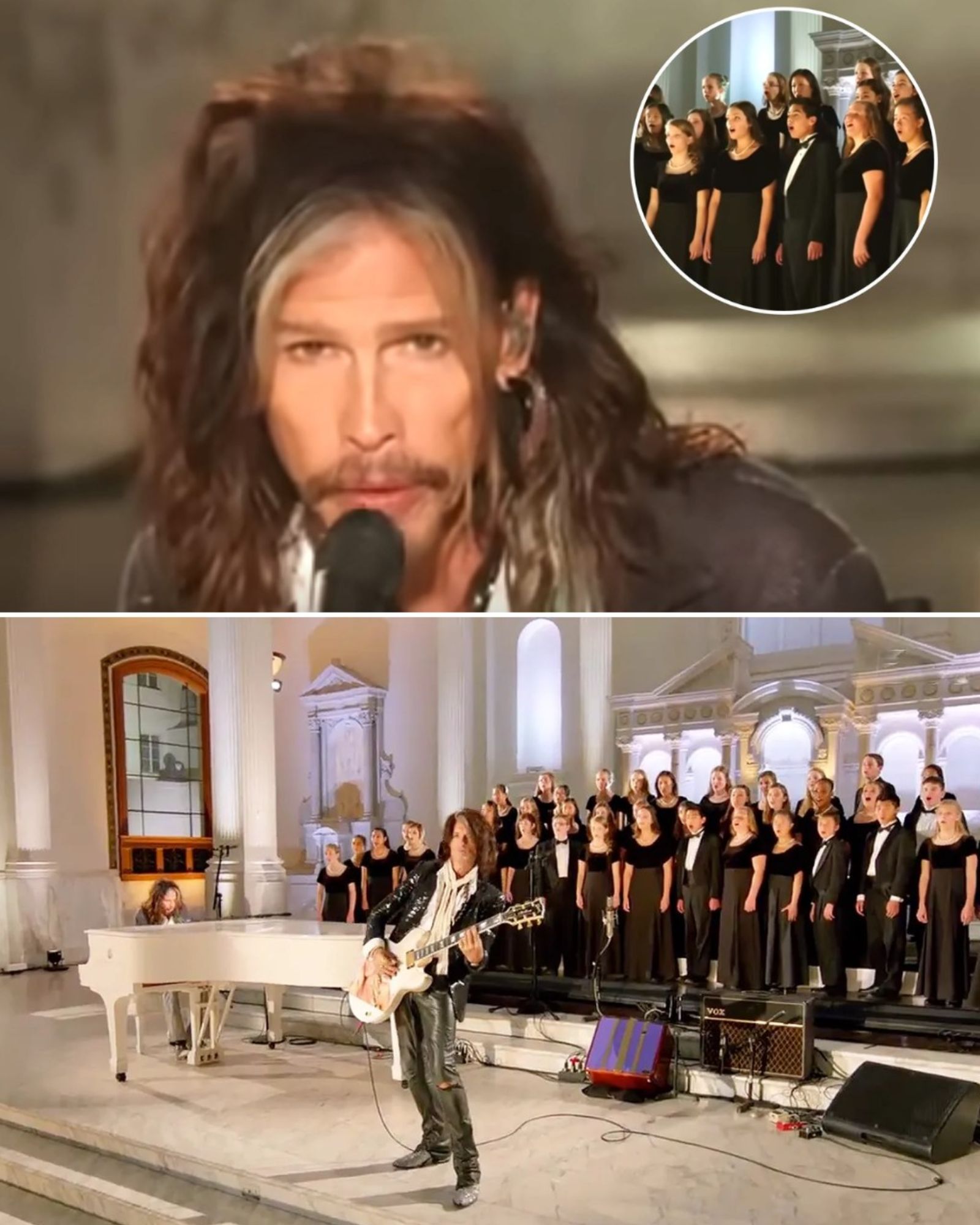 The tribute brought together Steven Tyler and Joe Perry — famously known as the “Toxic Twins” — alongside dozens of young singers in a solemn and atmospheric setting inside a large church. The result was a haunting interpretation that honored the victims and reflected the emotional impact the tragedy had on the city of Boston.