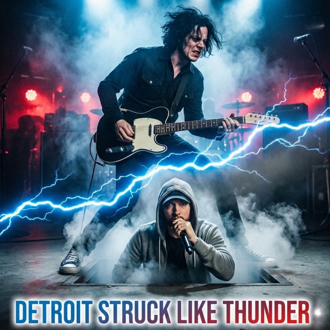 The scheduled halftime performer was Jack White — rock’s unflinching, guitar-slashing son of Detroit. He kicked things off with his track “That’s How I’m Feeling,” setting a cool, steady rock-n-roll tone that already felt like a hometown concert. But then came the surprise: rising from beneath the stage, clad in a blue Lions jacket over a hoodie, was none other than Eminem — Detroit’s most famous—and the city’s hardest-to-ignore—voice of hip-hop.