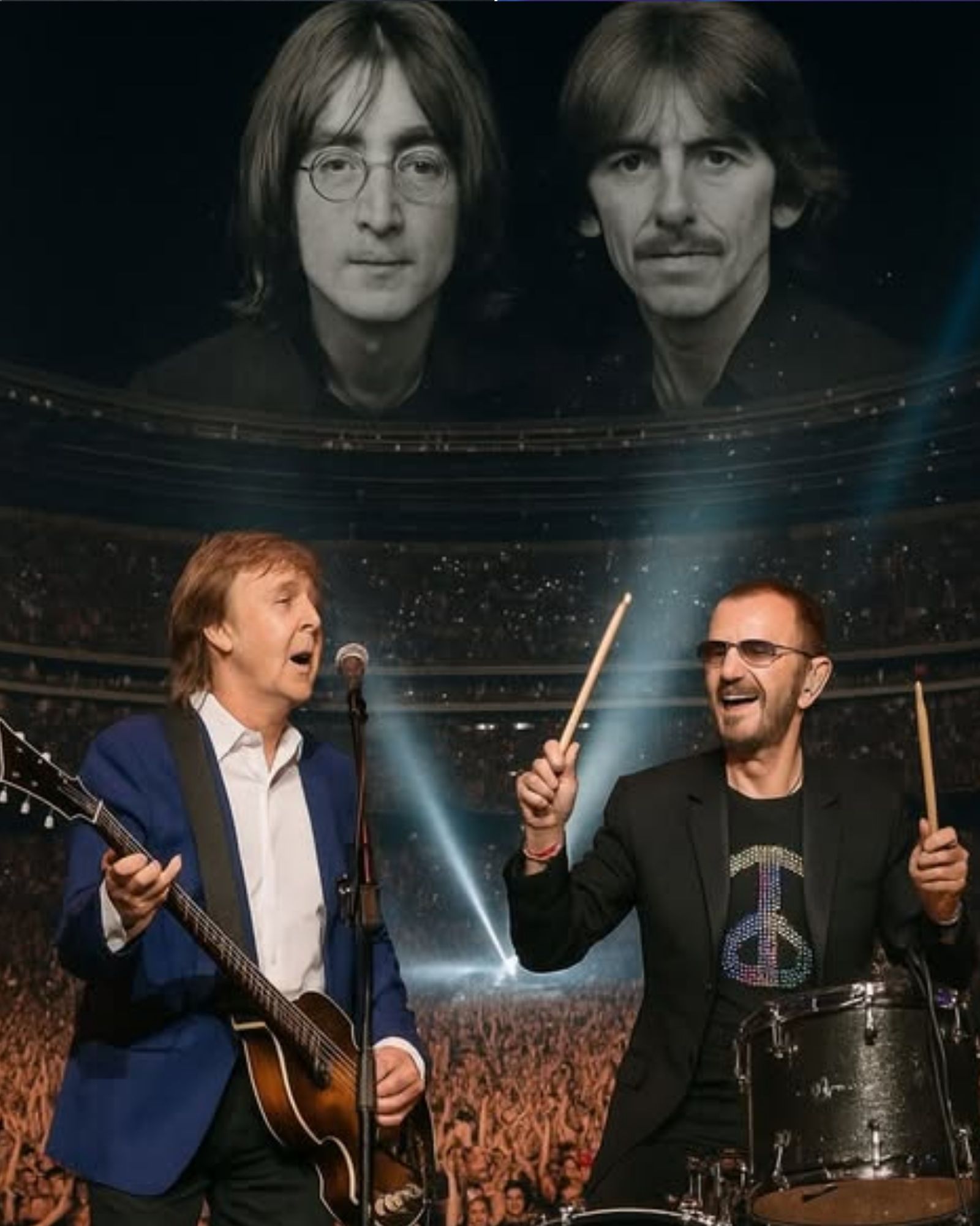Ringo, seated just behind him, brushed the snare with a gentleness that said more than words ever could. His rhythm was soft, steady — a quiet reminder that he had been there through it all. It felt as though he was keeping time not just for the song, but for their shared past, for the years that had carved them into who they are today.