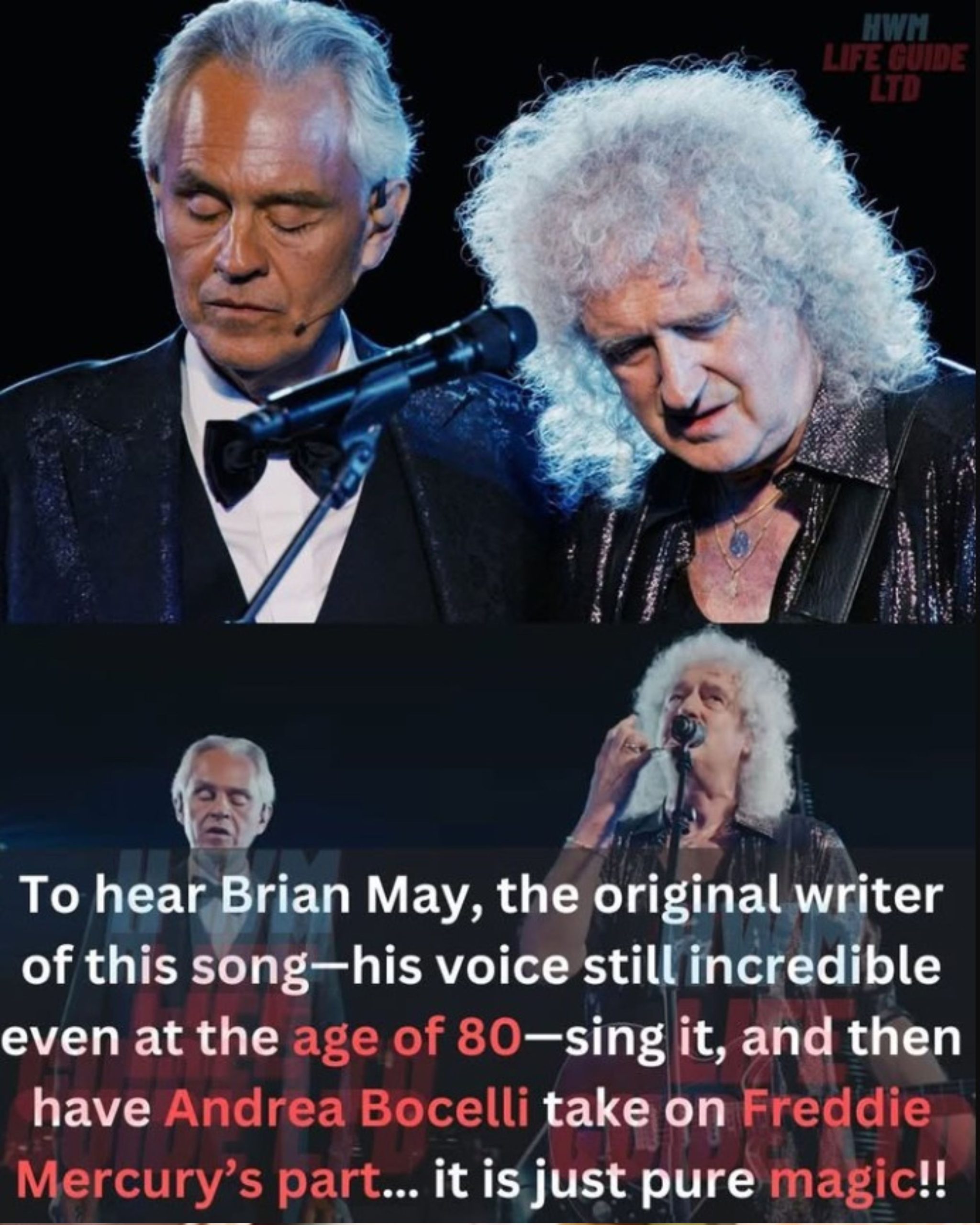 Originally composed by May for the 1986 film Highlander, “Who Wants To Live Forever” explores themes of eternal love and mortality. It was a natural fit for Bocelli’s voice, known for its expressive phrasing and emotional scope. On stage, May accompanied on guitar and vocals while Bocelli led with reverent precision. The resulting harmony — between voice, strings, and Queen’s iconic Red Special — left the audience awestruck.