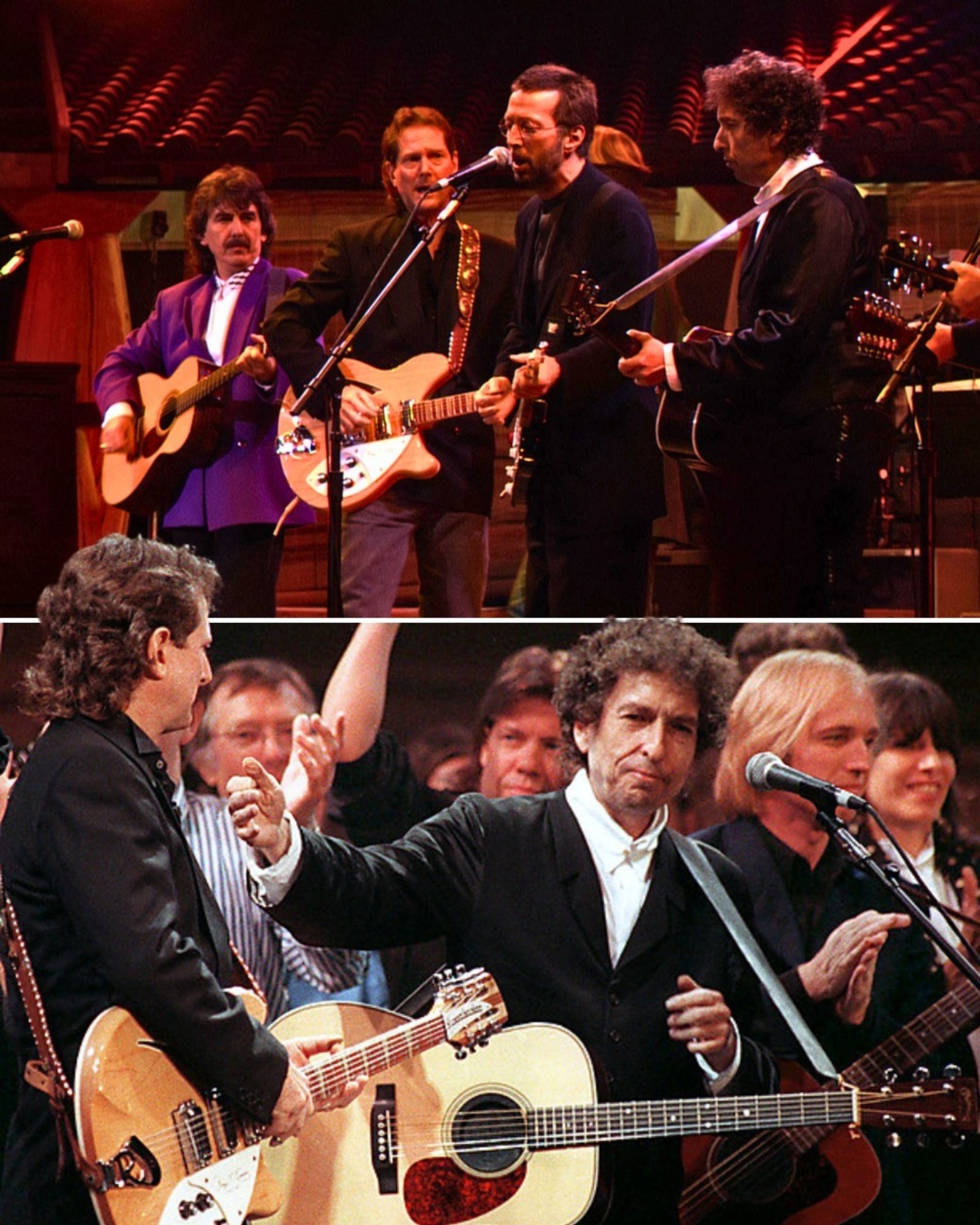 With Bob Dylan joined by Roger McGuinn, Tom Petty, Neil Young, Eric Clapton, and George Harrison, the performance felt less like a concert and more like history revealing itself in real time. These were not just famous names standing side by side; they were artists whose paths had shaped modern music, converging to honor the songwriter who influenced them all.