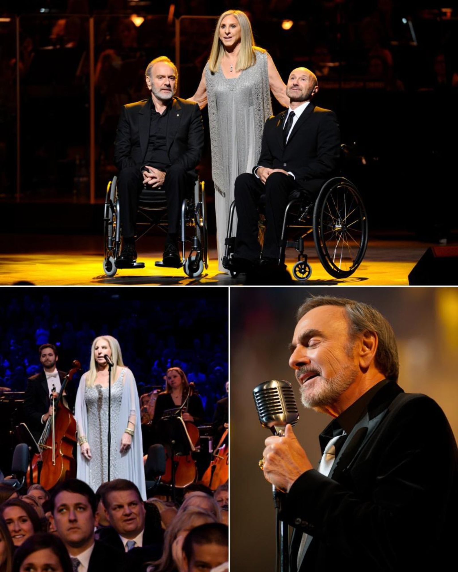 It was meant to be a quiet evening of remembrance — a gentle tribute to timeless voices that once defined generations. But under the soft, golden lights of the Los Angeles Performing Arts Center, something truly extraordinary unfolded. When the curtain rose, the audience gasped: Neil Diamond and Phil Collins appeared side by side, both seated in elegant black wheelchairs. Between them stood Barbra Streisand, glowing in a silver gown that shimmered like liquid light. For a moment, the entire hall held its breath. Then, softly, a single note began.