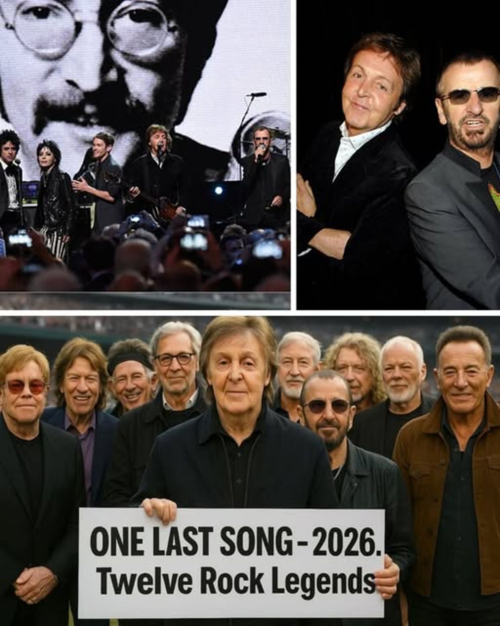 Twelve rock legends. One stage. One unforgettable farewell. In 2026, some of the most iconic figures in music history will come together for ONE LAST SONG — a global tour marking what many are calling “the greatest gathering in rock history.” Sir Paul McCartney, Ringo Starr, Elton John, Mick Jagger, Keith Richards, Eric Clapton, Roger Daltrey, Pete Townshend, David Gilmour, Brian May, Robert Plant, and Bruce Springsteen will unite for a tour that celebrates not just a genre, but a movement that shaped the very soul of modern music.