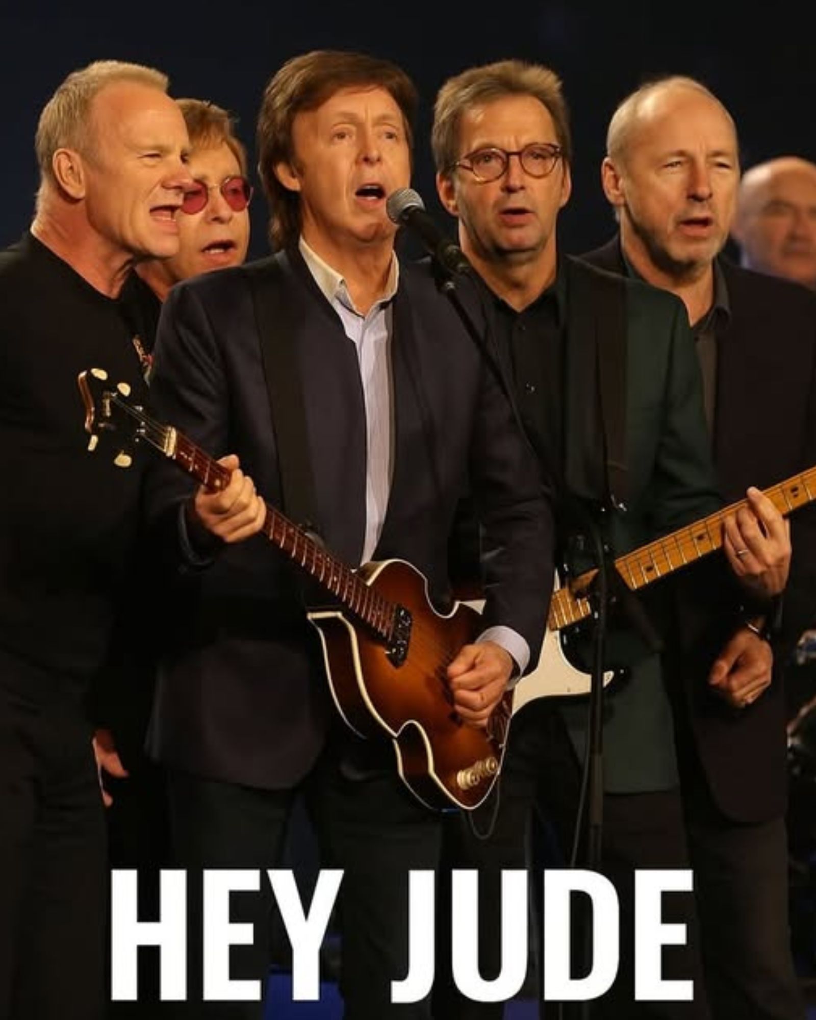 In the realm of unforgettable live performances, few moments shine brighter than the night rock royalty joined forces to perform one of the most beloved anthems in music history—“Hey Jude.” At the heart of it was Paul McCartney, the original voice behind the Beatles classic, joined by an ensemble of legends: Sting, Elton John, Eric Clapton, Mark Knopfler, and Phil Collins. Together, they created a musical moment that transcended time and genre.