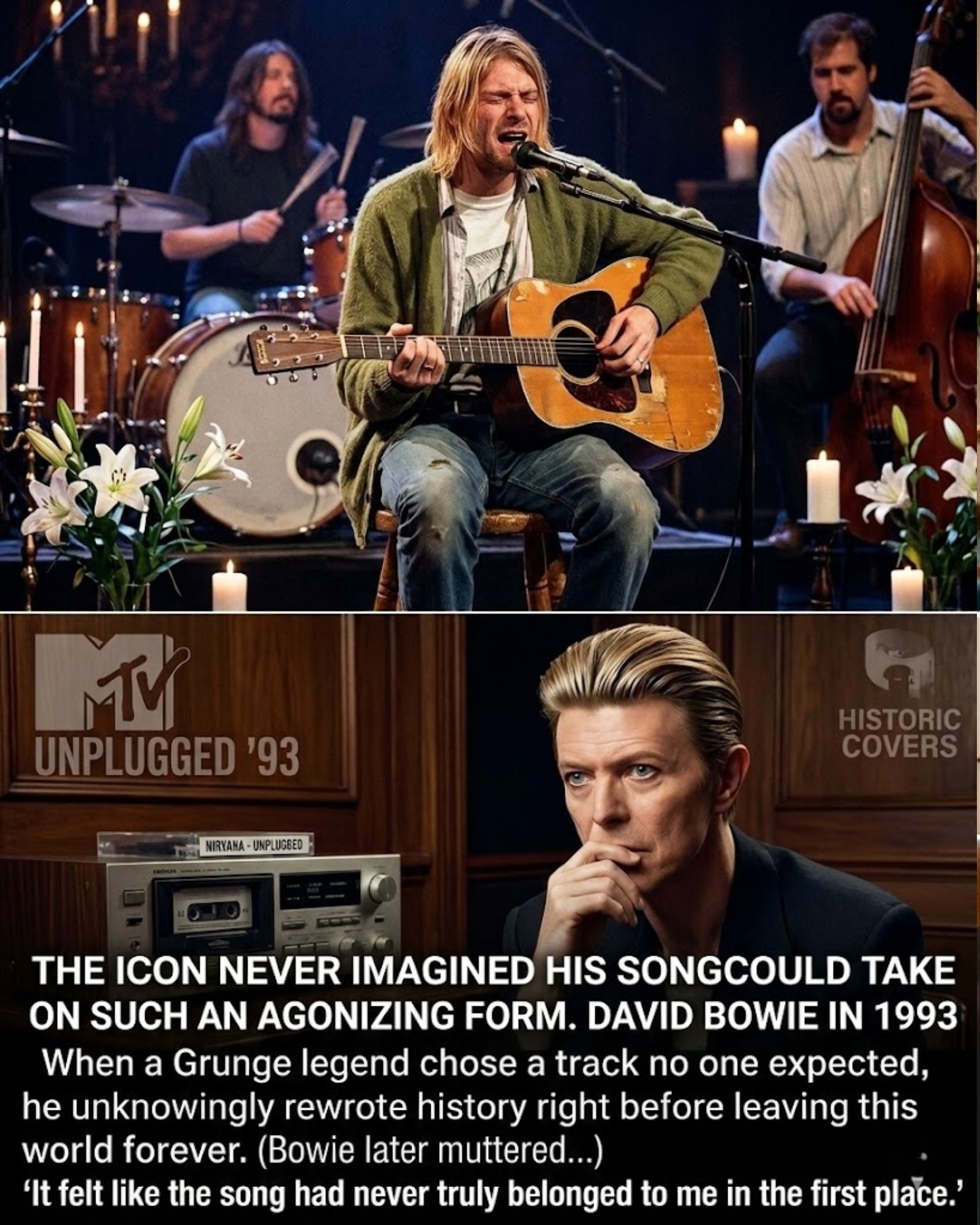 Stories have circulated for years about how deeply David Bowie was affected when he first heard the recording. Whether repeated exactly or softened by time, the heart of those stories remains the same: David Bowie recognized that Kurt Cobain had entered the song in a way few artists ever do. Not as a visitor, but as someone who already lived there.