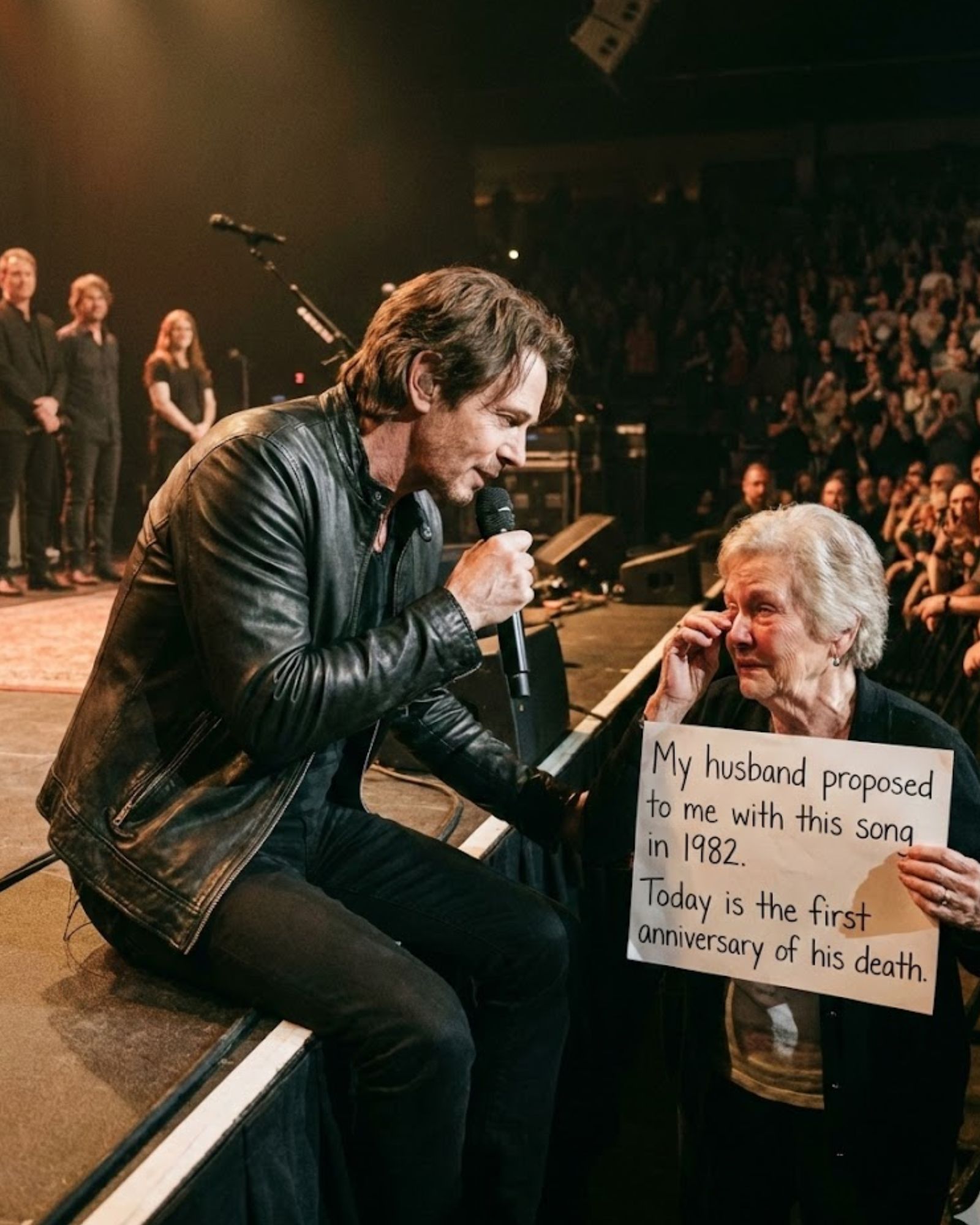 The woman, trembling, nodded and held the sign higher. The giant screens above the stage zoomed in so everyone could see the message that had stopped a rock star in his tracks: