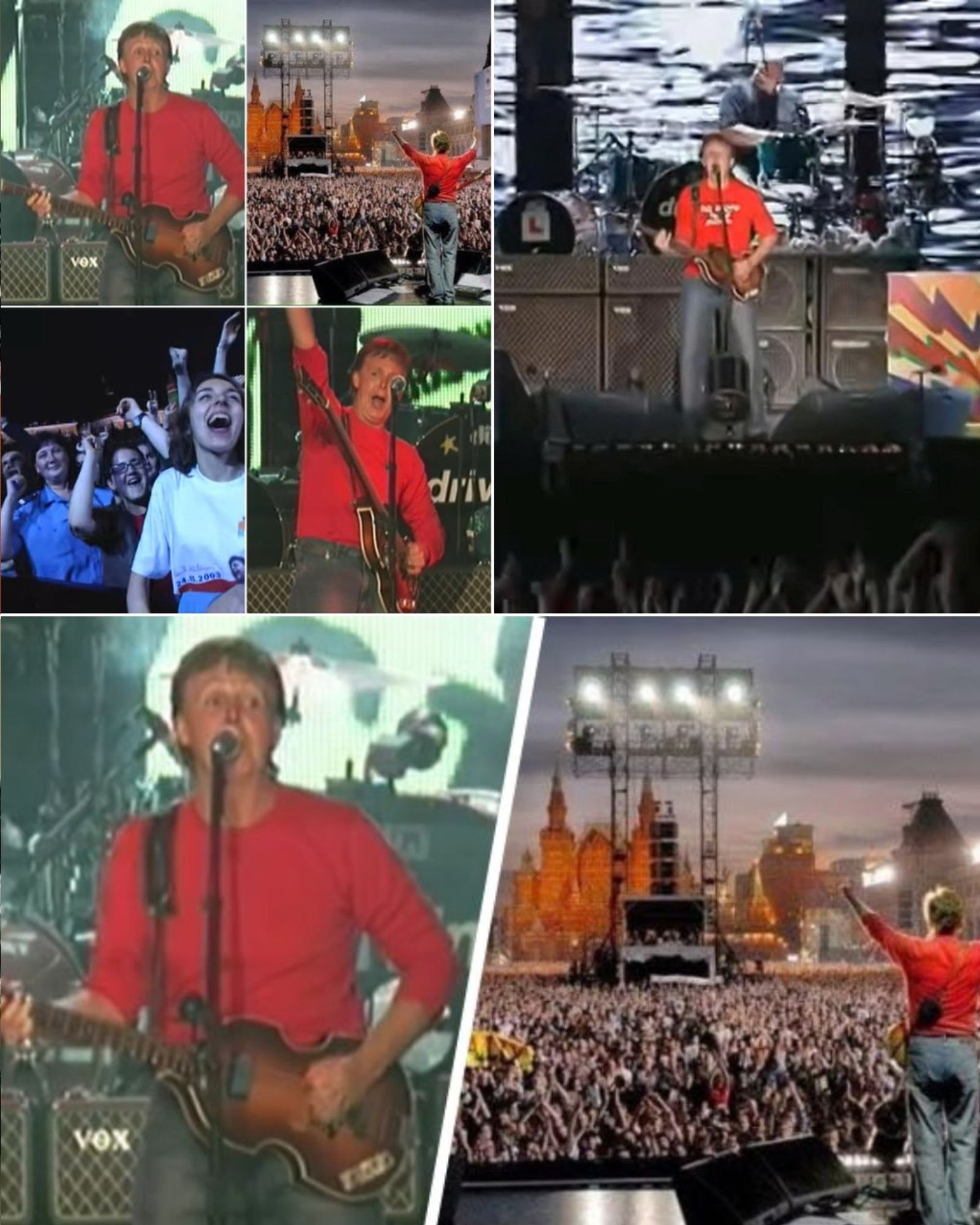 As McCartney stepped onstage, the air felt charged. Thousands were packed shoulder to shoulder, waving Beatles vinyl that had once been hidden under mattresses and smuggled between friends. TV cameras swept across the Kremlin towers as if preparing for a royal event.
