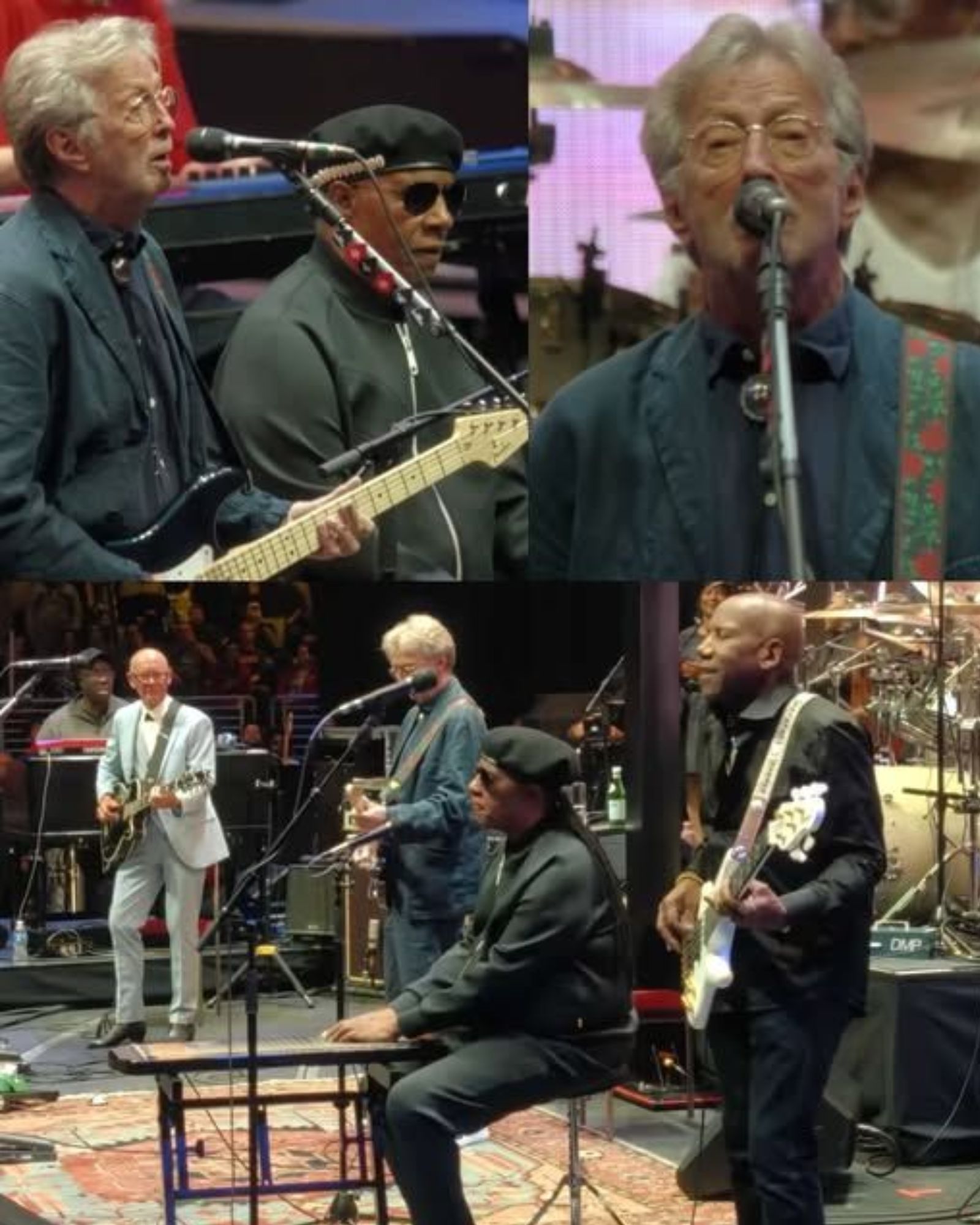 As Clapton opened with his signature blues-infused guitar intro, the audience instantly erupted with excitement. Moments later, Stevie Wonder made his entrance, wearing his iconic sunglasses and sharing his radiant smile with the crowd, igniting an even greater wave of energy throughout the arena.
