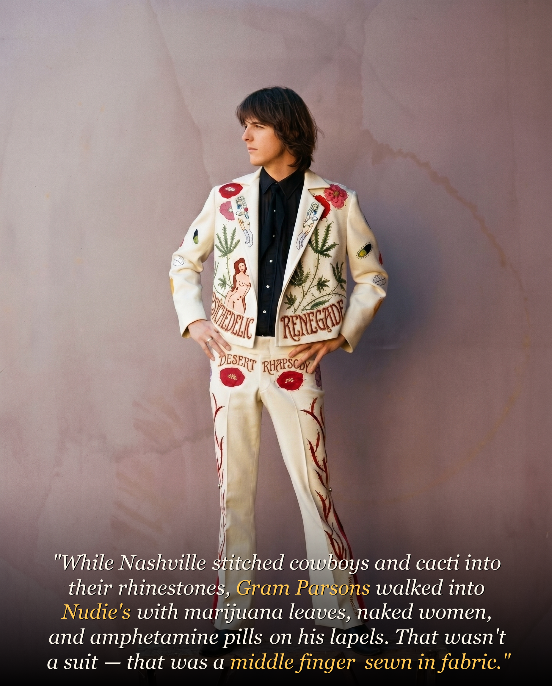 When Gram Parsons walked into Nudie’s Rodeo Tailors, Gram Parsons was not looking for a polished tribute to tradition. Gram Parsons wanted a suit that said exactly who Gram Parsons was: restless, provocative, funny, self-destructive, and completely uninterested in asking permission. Instead of the expected Western imagery, Gram Parsons commissioned a white suit covered with symbols that felt shocking, even outrageous, to many in country circles.