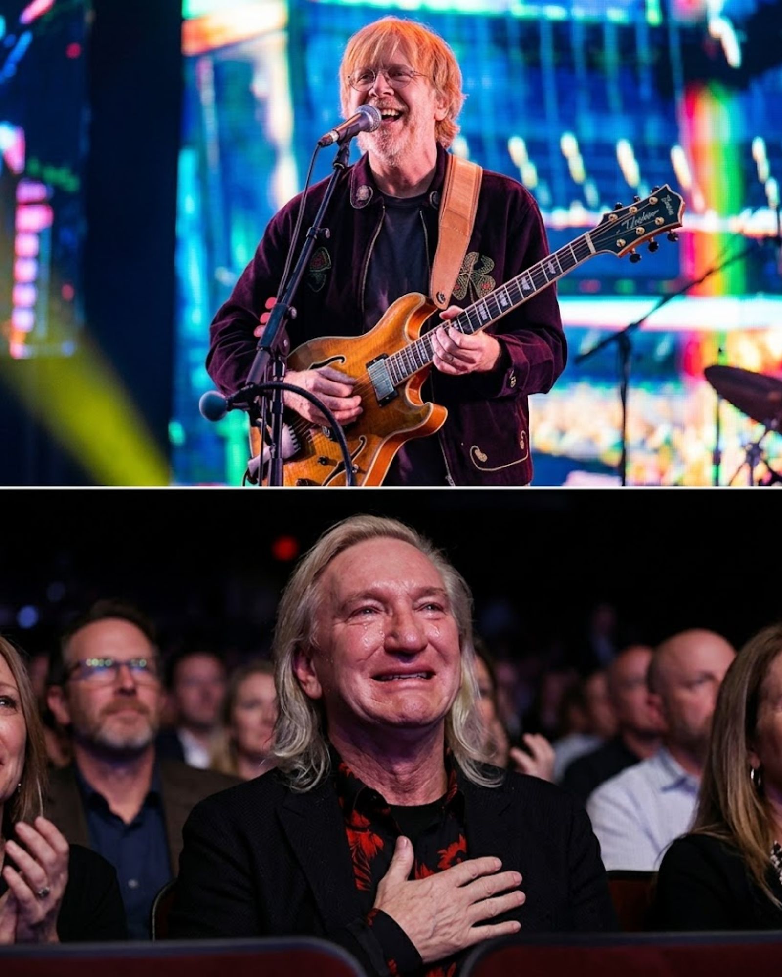 The reaction was instant. The room exploded. Not with polite applause, but with the kind of roar that only comes when one generation of heroes recognizes another. Trey Anastasio smiled, almost like he knew exactly how emotional the moment had become, and gently joked that he did not mean to embarrass Joe Walsh. It broke the tension for a second, but only for a second.