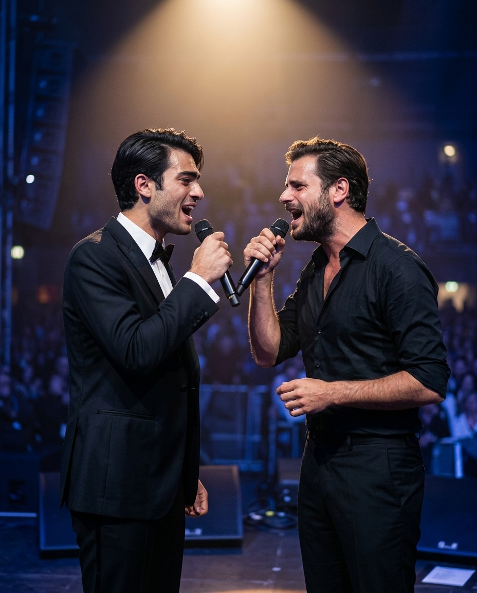Matteo Bocelli stood there with that calm, warm presence audiences know so well. Across from Matteo Bocelli was HAUSER, intense and focused, carrying the kind of energy that usually explodes through a cello. But this time, the cello was not there. That was the first surprise. No instrument resting in HAUSER’s hands. No piano nearby for Matteo Bocelli. No band behind them waiting for a cue. Nothing but breath, timing, instinct, and trust.